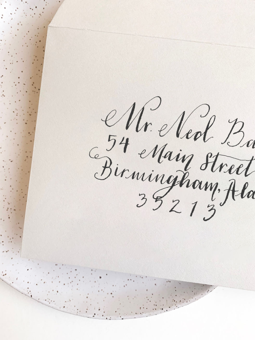 Your envelopes are the first impression your guests will have of your next upcoming event. The calligraphy style you choose indicates the tone of your special day. This dreamy, romantic writing style pairs well with many different wedding styles including Bohemian, Garden, Modern/Industrial, Rustic and Beach. It can work equally well with anniversary parties, birthday parties, baby showers and bridal showers.